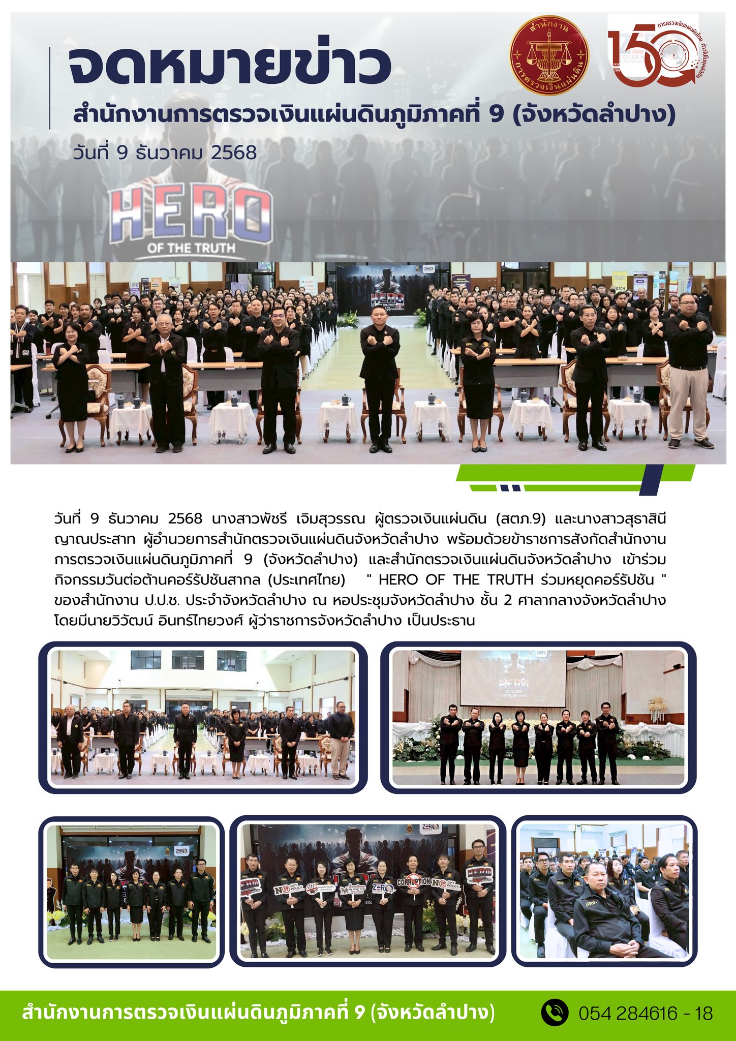 วันที่ 9 ธันวาคม 2568 นางสาวพัชรี เจิมสุวรรณ ผู้ตรวจเงินแผ่นดิน (สตภ.9) และนางสาวสุธาสินี ญาณประสาท ผู้อำนวยการสำนักตรวจเงินแผ่นดินจังหวัดลำปาง พร้อมด้วยข้าราชการสังกัดสำนักงานการตรวจเงินแผ่นดินภูมิภาคที่ 9 (จังหวัดลำปาง) และสำนักตรวจเงินแผ่นดินจังหวัดลำปาง เข้าร่วมกิจกรรมวันต่อต้านคอร์รัปชันสากล (ประเทศไทย) ” HERO OF THE TRUTH ร่วมหยุดคอร์รัปชัน ” ของสำนักงาน ป.ป.ช. ประจำจังหวัดลำปาง ณ หอประชุมจังหวัดลำปาง ชั้น 2 ศาลากลางจังหวัดลำปาง โดยมีนายวิวัฒน์ อินทร์ไทยวงศ์ ผู้ว่าราชการจังหวัดลำปาง เป็นประธาน