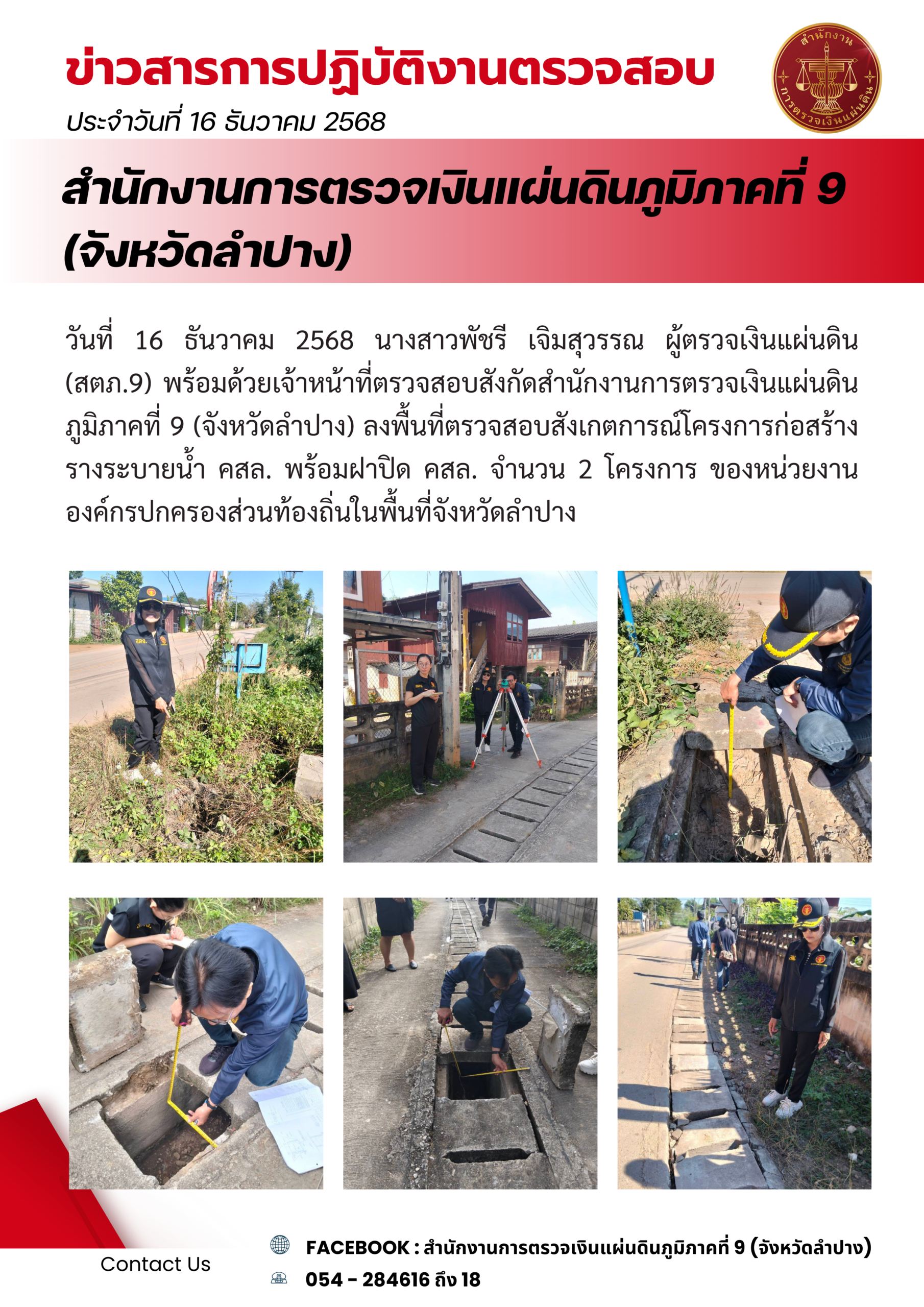 วันที่ 16 ธันวาคม 2568 นางสาวพัชรี เจิมสุวรรณ ผู้ตรวจเงินแผ่นดิน (สตภ.9) พร้อมด้วยเจ้าหน้าที่ตรวจสอบสังกัดสำนักงานการตรวจเงินแผ่นดินภูมิภาคที่ 9 (จังหวัดลำปาง) ลงพื้นที่ตรวจสอบสังเกตการณ์โครงการก่อสร้างรางระบายน้ำ คสล. พร้อมฝาปิด คสล. จำนวน 2 โครงการ ของหน่วยงานองค์กรปกครองส่วนท้องถิ่นในพื้นที่จังหวัดลำปาง