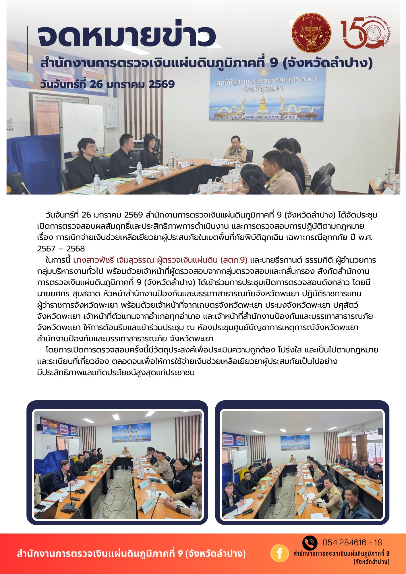 วันจันทร์ที่ 26 มกราคม 2569 สำนักงานการตรวจเงินแผ่นดินภูมิภาคที่ 9 (จังหวัดลำปาง) ได้จัดประชุมเปิดการตรวจสอบผลสัมฤทธิ์และประสิทธิภาพการดำเนินงาน และการตรวจสอบการปฏิบัติตามกฎหมาย เรื่อง การเบิกจ่ายเงินช่วยเหลือเยียวยาผู้ประสบภัยในเขตพื้นที่ภัยพิบัติฉุกเฉิน เฉพาะกรณีอุทกภัย ปี พ.ศ. 2567 – 2568