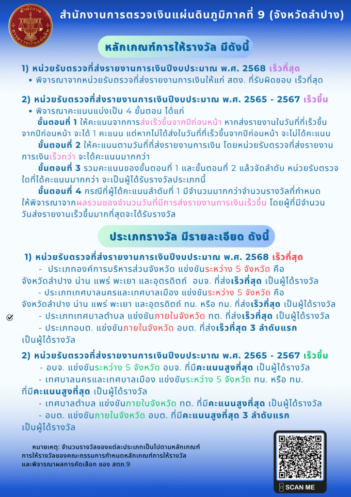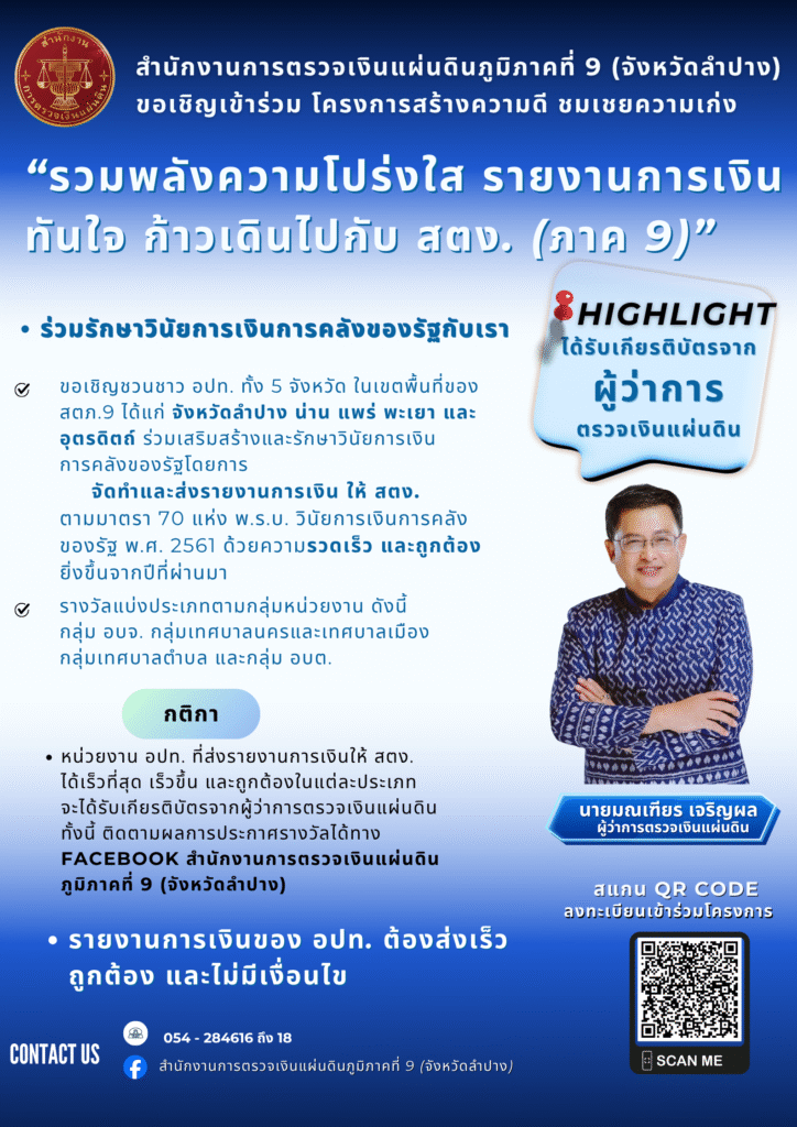 ขอเชิญชวนชาว อปท. ทั้ง 5 จังหวัด ในเขตพื้นที่ของสตภ.9 ได้แก่ จังหวัดลำปาง น่าน แพร่ พะเยา และอุตรดิตถ์ ร่วมเสริมสร้างและรักษาวินัยการเงินการคลังของรัฐโดยการจัดทำและส่งรายงานการเงิน ให้ สตง. ตามมาตรา 70 แห่ง พ.ร.บ. วินัยการเงินการคลังของรัฐ พ.ศ. 2561 ด้วยความรวดเร็ว และถูกต้องยิ่งขึ้นจากปืที่ผ่านมา รางวัลแบ่งประเภทตามกลุ่มหน่วยงาน ดังนี้ กลุ่ม อบจ. กลุ่มเทศบาลนครและเทศบาลเมือง กลุ่มเทศบาลตำบล และกลุ่ม อบต. ทั้งนี้ ท่านสามารถอ่านรายละเอียดเพิ่มเติมได้ตามภาพประชาสัมพันธ์ที่แนบมาด้วย
